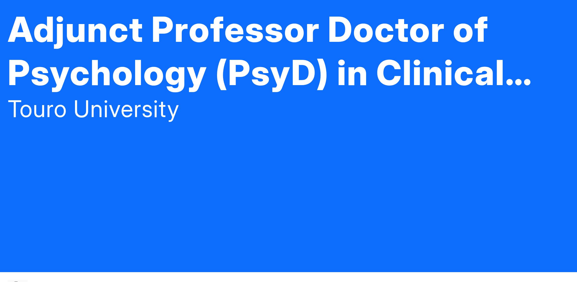 The PsyD Program in Clinical Psychology Health Emphasis within the School of Health Sciences of Touro University invites applicants for a part-time faculty position. Adjunct instructor is responsible for instruction course preparation developing instructional materials grading and assessment and professional responsibilities as a member of the instructional team of a school or academic department. The college places a high priority on teaching excellence and research success with an expectation that the candidate will also be active in their professional field. The preferred candidate will have both clinical and teaching experience in psychological assessment emphasizing objective personality assessment. The Touro College PsyD program in clinical psychology has a health emphasis and combines a strong focus on clinical practice in traditional and integrative health care settings research and evidence-based treatment.