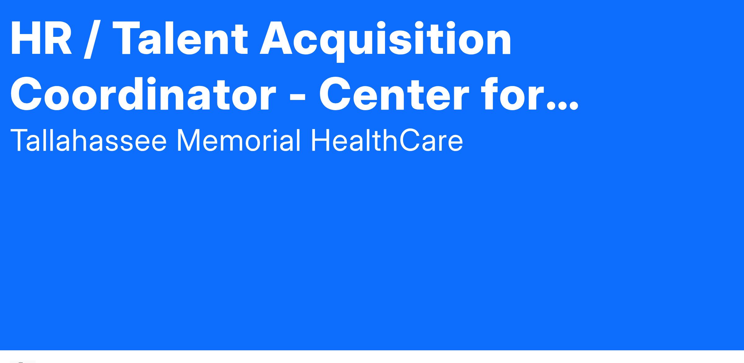 Tallahassee Memorial HealthCare is an equal opportunity employer and drug-free workplace. All employment is contingent upon successful completion of a drug screen, background check, reference verification, health assessment, and credential/license verification.