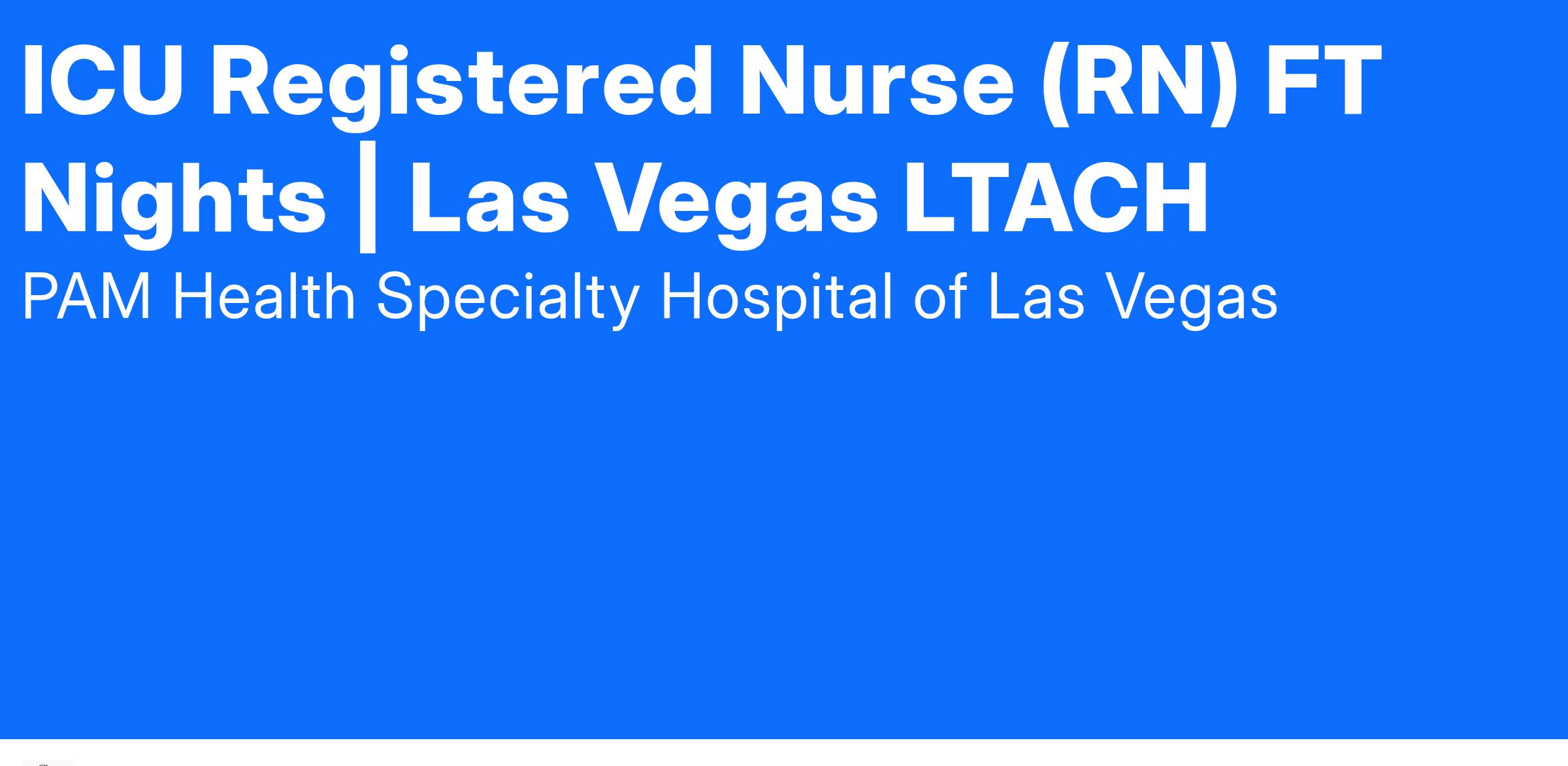 PAM Health Specialty Hospital of Las Vegas is a 70 bed Critical Care Hospital providing acute care services to patients recovering from serious illnesses or injuries. Often our patients require additional critical care services for medically complex conditions such as trauma, infectious diseases, wound healing, cardiovascular disease, stroke, amputation and ventilator weaning. We offer an opportunity to work in a fast-paced and friendly work environment where you really get to know your patients and their families.