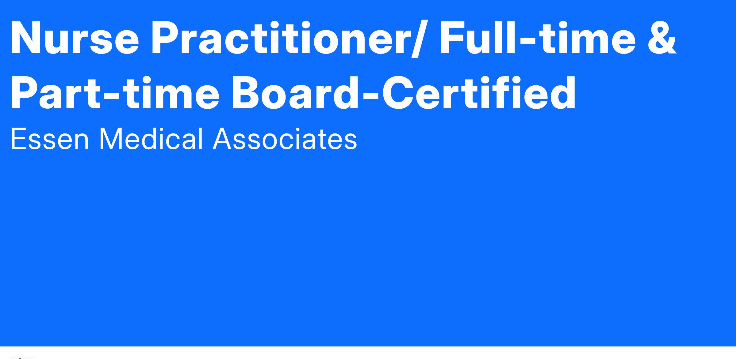 Job Summary: The Nurse Practitioner will be part of Essen growing medical professionals. Your primary responsibility will be to provide advanced primary and/or specialty care to our patients. Responsibilities will include but not limited to, performing physical exams, recording patient medical history, creating care plans and administering diagnostic test.