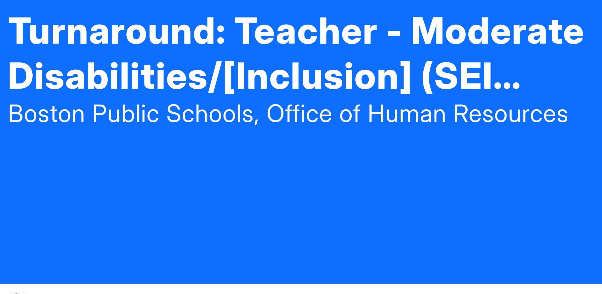 Boston Public Schools seeks an exceptional Special Education [Inclusion] teacher with an SEI Endorsement who is highly qualified and knowledgeable to join our community of teachers, learners and leaders. This is an exciting opportunity for teachers who desire to serve where their efforts matter. In BPS, the teachers and leaders are committed to the vision of high expectations for achievement, equal access to high levels of instruction, the achievement of academic proficiency for all students, and the closing of the achievement gap among subgroups within the schools. BPS is a great place for those who seek to work in an environment that supports their creativity and innovation, and respects their skills and abilities as a teacher.